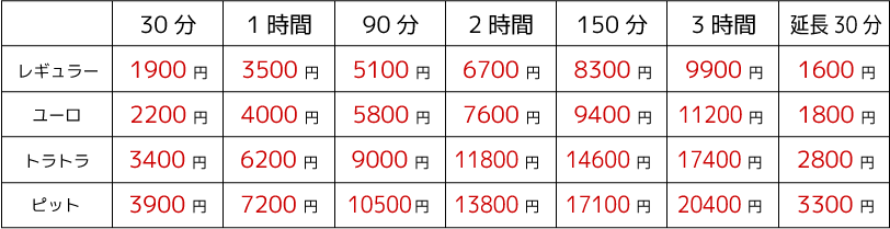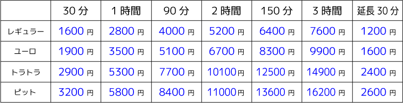 | 安全マット 大 | : | 600 円/30分 (延長300 円/15分) |