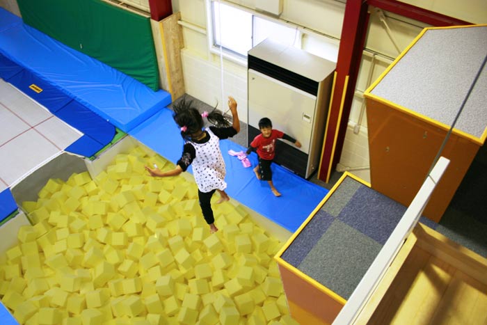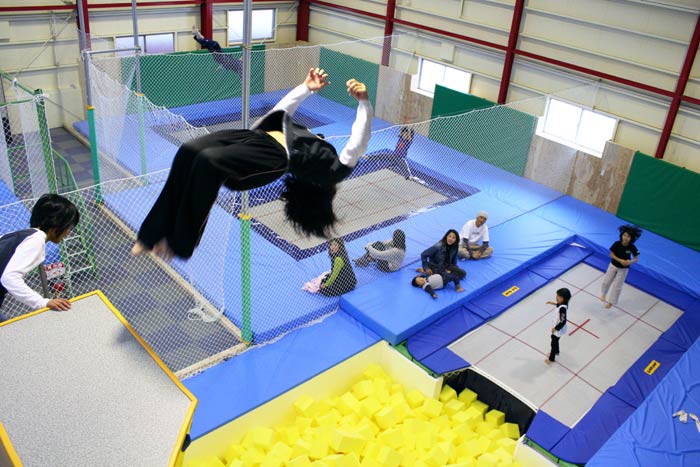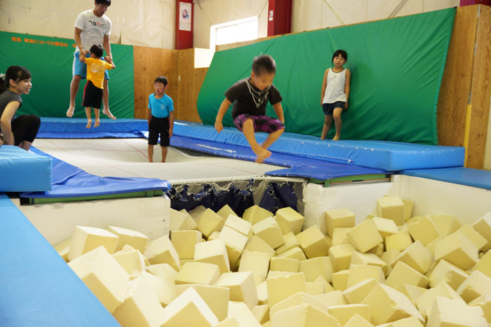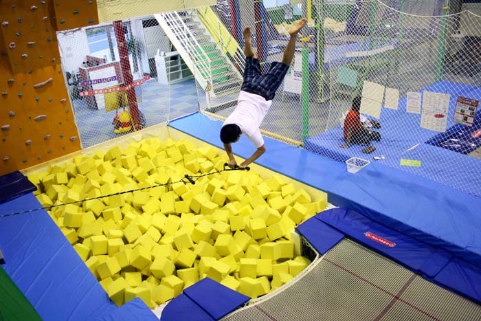 「ピット」とはスポンジで満たされたプールのこと。大量のスポンジが着地の衝撃を吸収してくれるので、トランポリンから思い切りダイブ出来ます。